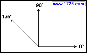 DIRECTION must be entered in degrees, increasing ‘counterclockwise’. In rather unscientific terminology, a vector pointing directly to the ‘right’ has a direction of zero degrees. A vector pointing straight ‘up’ has an angle of 90 degrees. A vector pointing to the ‘upper left’ is at a 135 degree angle and so on. (see diagram below)